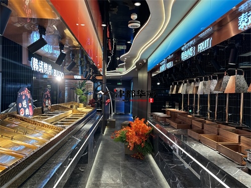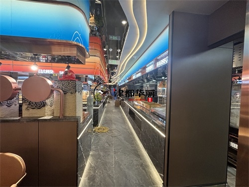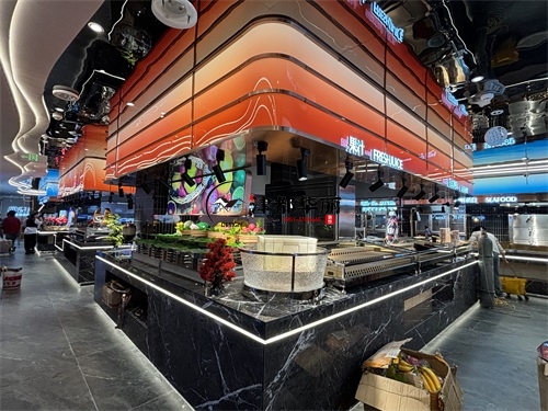 今天分享的是银川回香渔自助餐厅装修设计实景,这家自助餐厅装修设计将“潮流科技感”与“轻奢休闲风”两种风格巧妙融合在一起,既贴合当下年轻消费群体的审美偏好,又通过空间层次的营造兼顾了自助餐饮的功能需求,是近年餐饮空间设计的典型流行范式。前厅的顶面与墙面采用波浪形的曲面造型,搭配橙红、宝蓝等高饱和度渐变色彩,叠加内嵌式线性灯带的勾勒,既打破了传统餐厅的规整感,又通过科技感的光影营造出“赛博休闲”的氛围——这种手法既借鉴了网红餐饮的“打卡属性”设计,又通过色彩分区(如橙红对应热菜区、宝蓝对应海鲜区)实现了功能引导,让顾客能快速识别餐区类型。